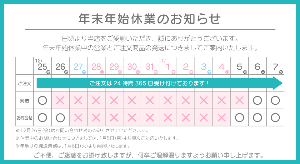 休暇中のご注文は上記期間も受け付けておりますが、製造・出荷は出荷は1月6日(火)より順次対応させていただきますのでご了承ください。