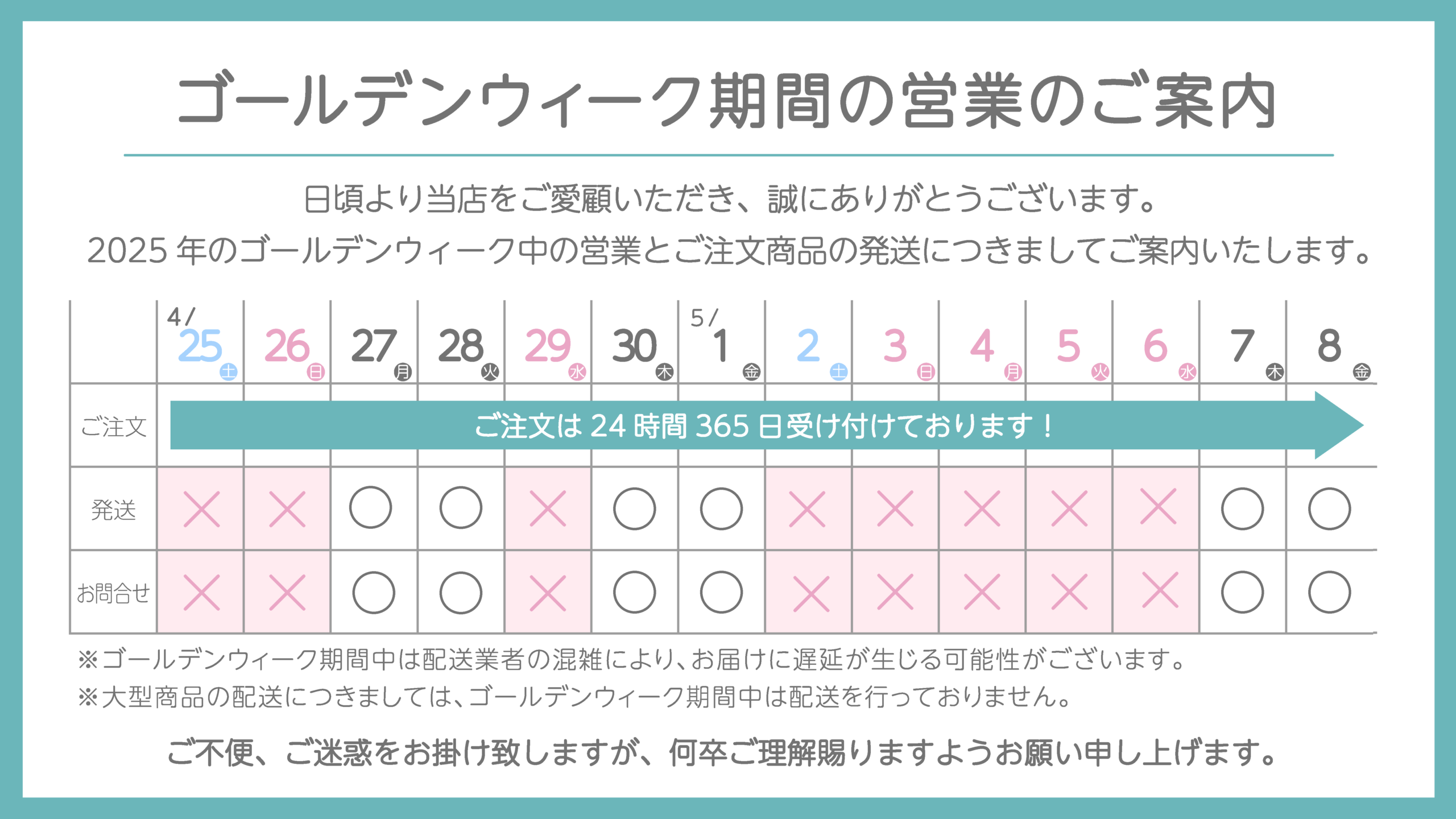 休暇中のご注文は上記期間も受け付けておりますが、製造・出荷は5月7日(木)より順次対応させていただきますのでご了承ください。